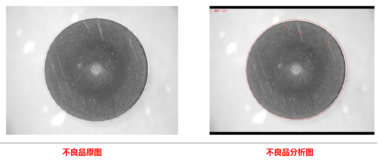 相機1頂部正光檢測不良品分析圖:NG 結(jié)論:可檢 檢測特征:頂部劃傷